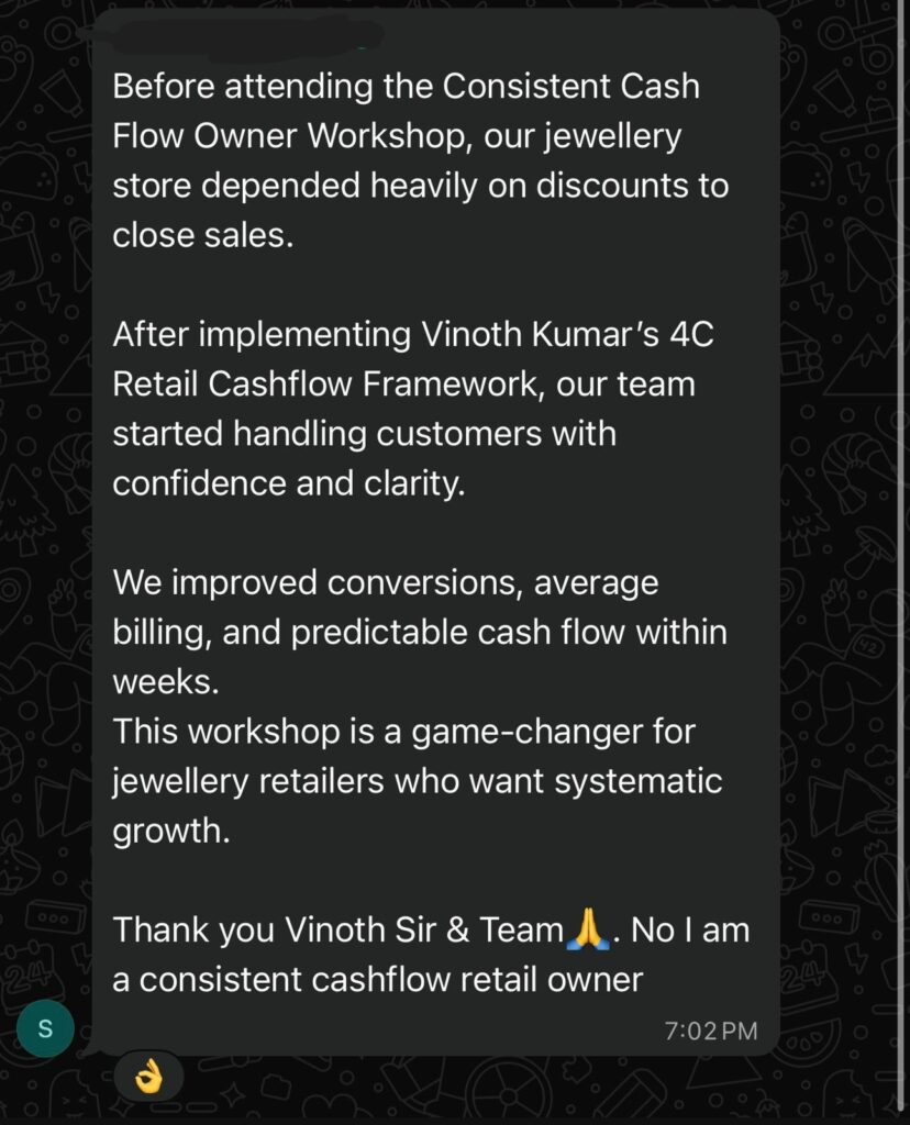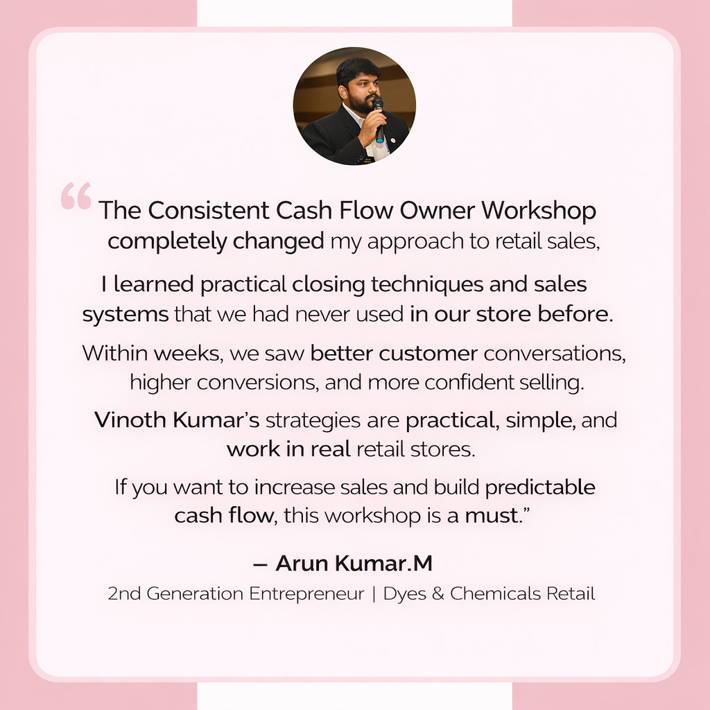 Vinoth Kumar G is a Leading Retail Cashflow Systems Coach and Business Growth Strategist known for transforming traditional retail business into predictable revenue engines.